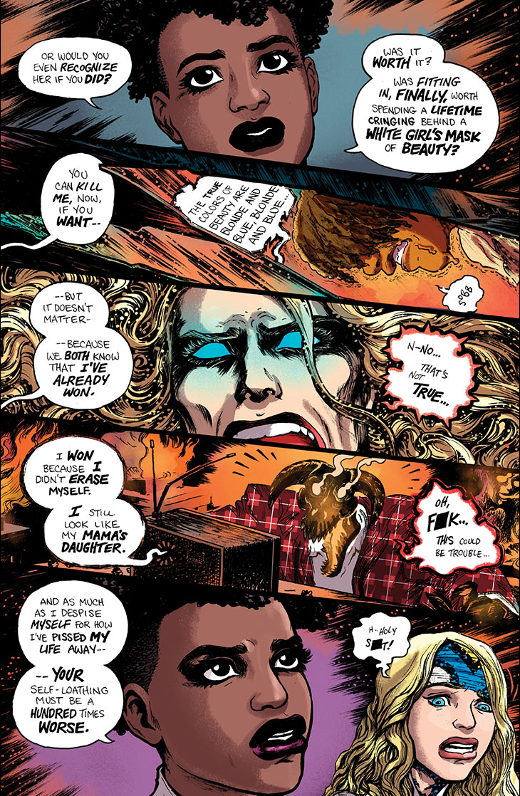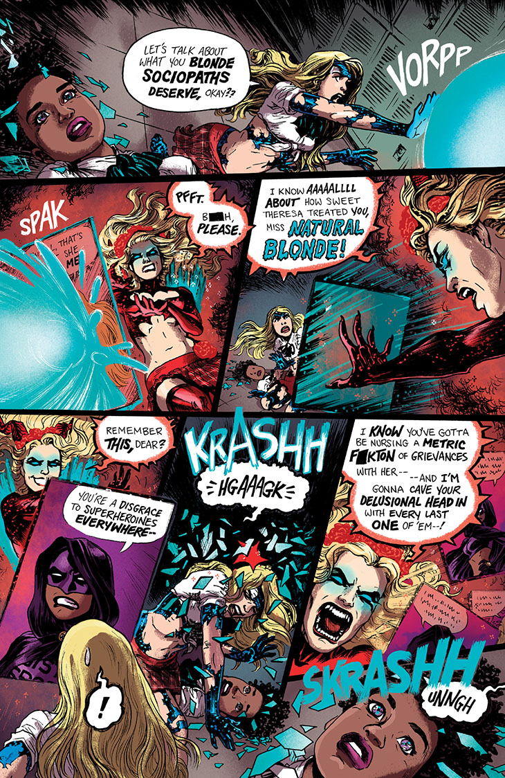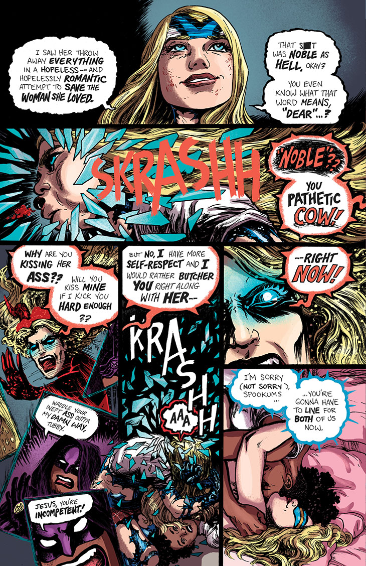 We continue serialization of the collected edition of the six-issue 2018 miniseries Empowered and Sistah Spooky’s High School Hell, written and laid out by me and featuring art and lettering by Guest Artist Carla “Speed” McNeil and coloring by Jenn Manley Lee.