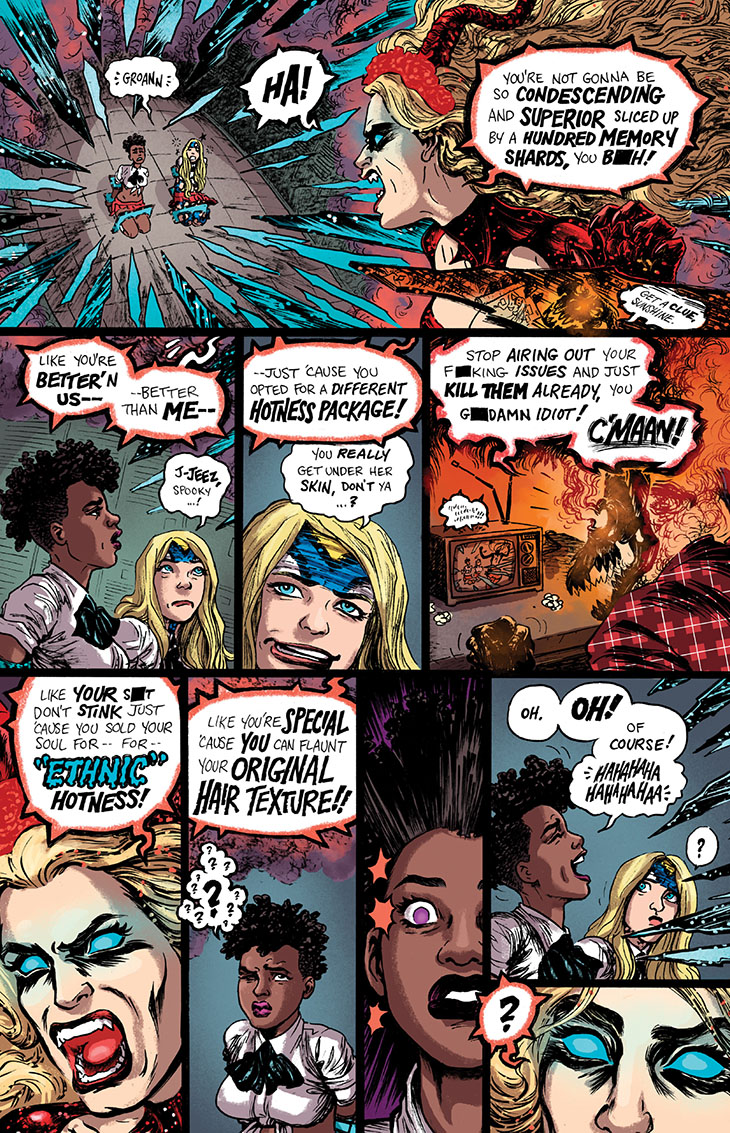 Panel 1: Note that the array of mirror shards threatening our heroines is a callback to the set of stony spears that a grief-stricken Spooky was telekinetically pointing at Emp during her crazed rant at the end of Empowered vol. 5 after Hannah's death.
