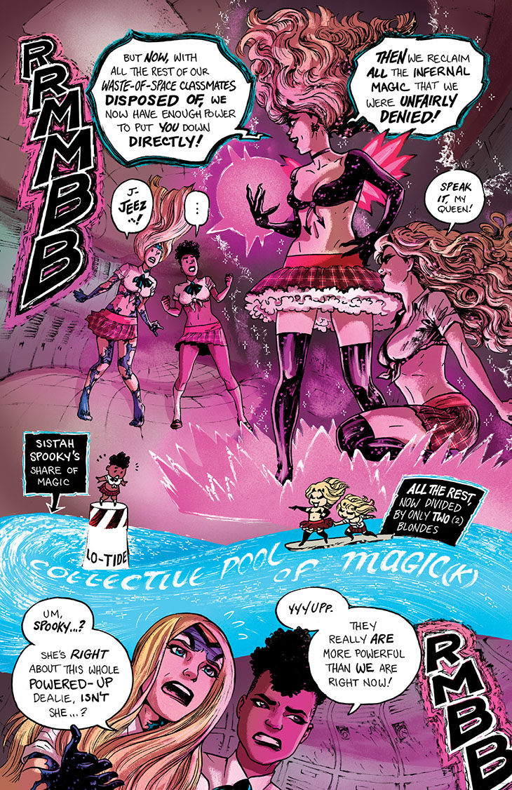 We continue serialization of the collected edition of the six-issue 2018 miniseries Empowered and Sistah Spooky’s High School Hell, written and laid out by me and featuring art and lettering by Guest Artist Carla “Speed” McNeil and coloring by Jenn Manley Lee.