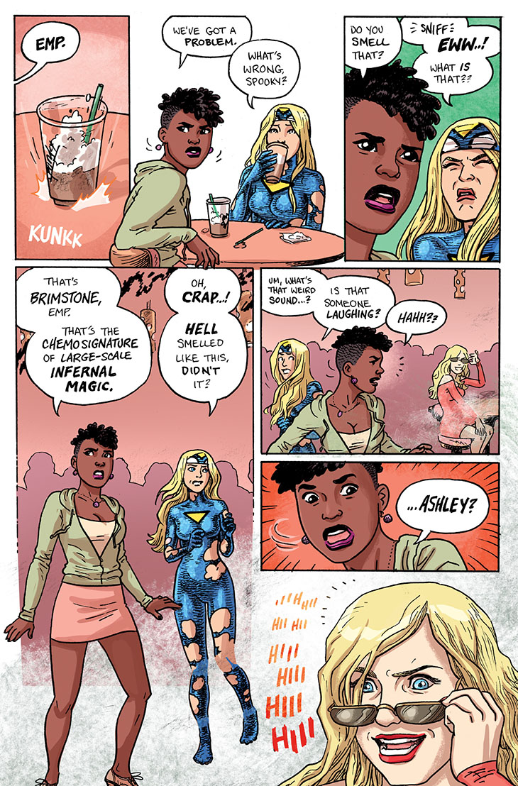 We continue serialization of the collected edition of the six-issue 2018 miniseries Empowered and Sistah Spooky’s High School Hell, written and laid out by me and featuring art and lettering by Guest Artist Carla “Speed” McNeil and coloring by Jenn Manley Lee.