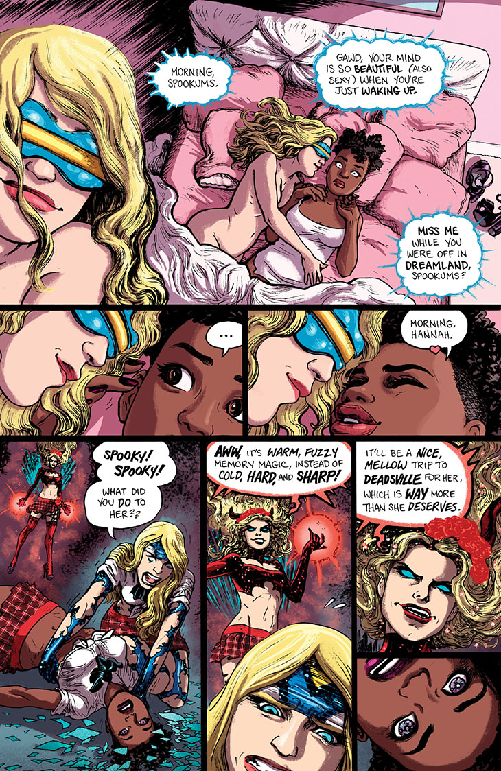 We continue serialization of the collected edition of the six-issue 2018 miniseries Empowered and Sistah Spooky’s High School Hell, written and laid out by me and featuring art and lettering by Guest Artist Carla “Speed” McNeil and coloring by Jenn Manley Lee.