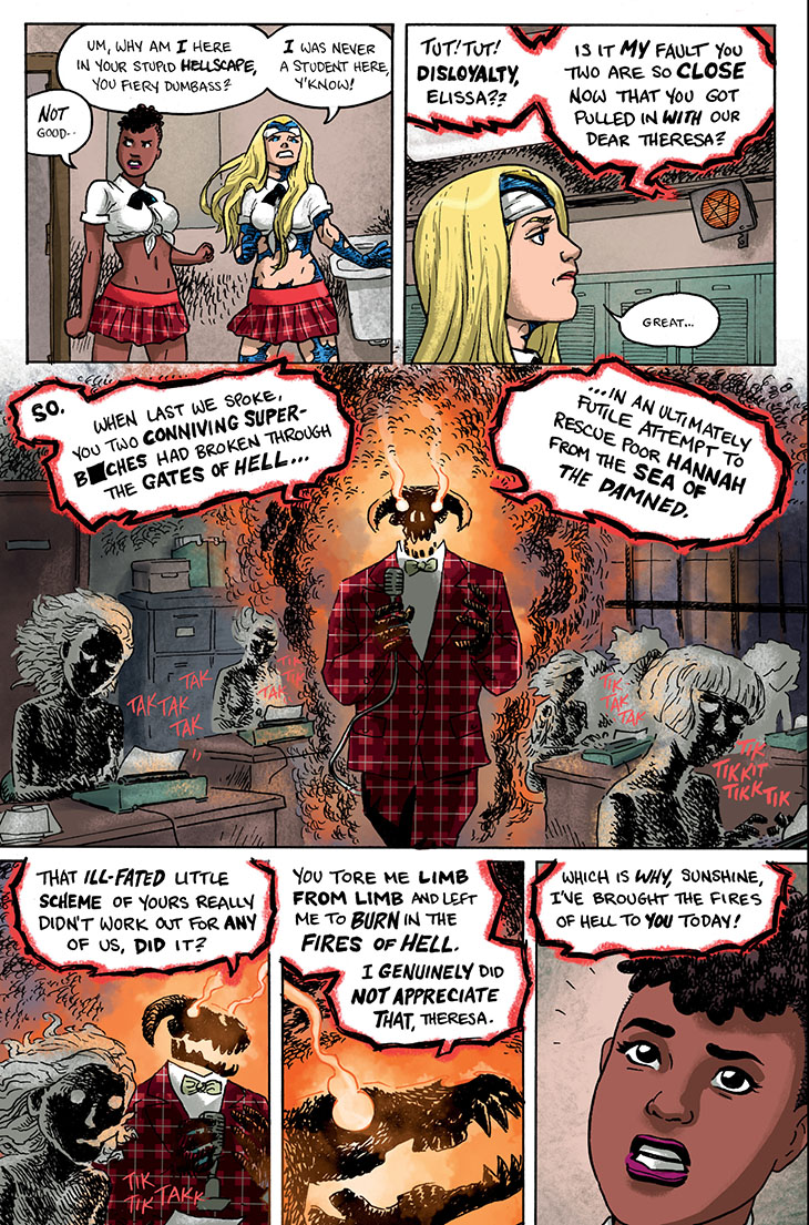 We continue serialization of the collected edition of the six-issue 2018 miniseries Empowered and Sistah Spooky’s High School Hell, written and laid out by me and featuring art and lettering by Guest Artist Carla “Speed” McNeil and coloring by Jenn Manley Lee.