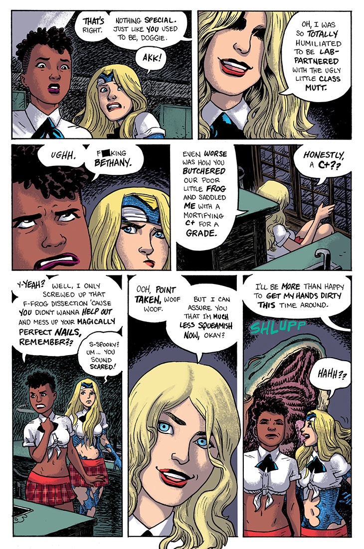 We continue serialization of the collected edition of the six-issue 2018 miniseries Empowered and Sistah Spooky’s High School Hell, written and laid out by me and featuring art and lettering by Guest Artist Carla “Speed” McNeil and coloring by Jenn Manley Lee.