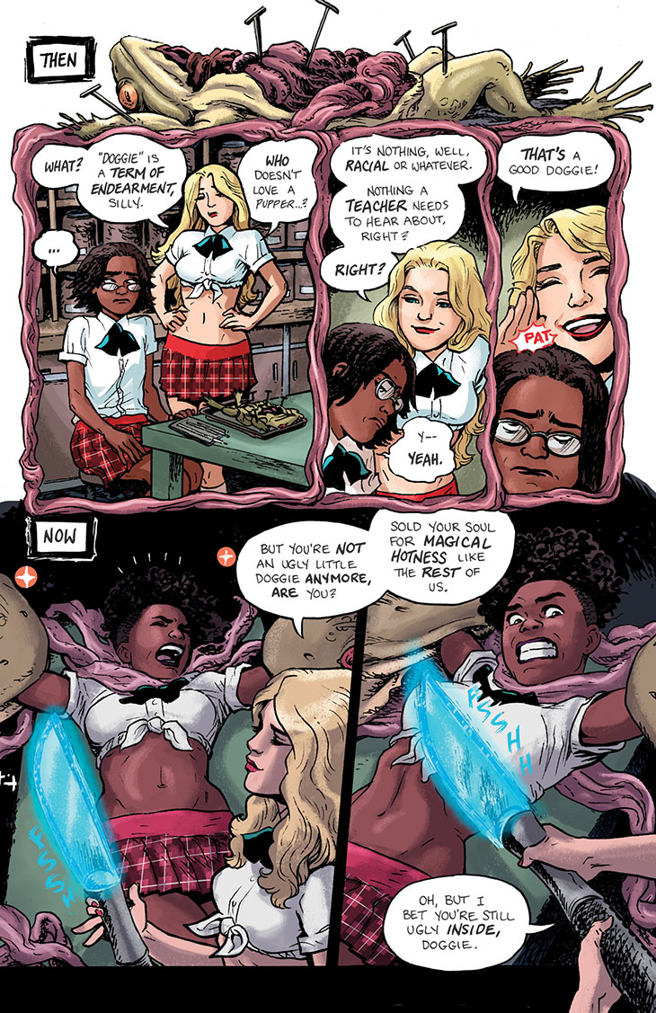 We continue serialization of the collected edition of the six-issue 2018 miniseries Empowered and Sistah Spooky’s High School Hell, written and laid out by me and featuring art and lettering by Guest Artist Carla “Speed” McNeil and coloring by Jenn Manley Lee.