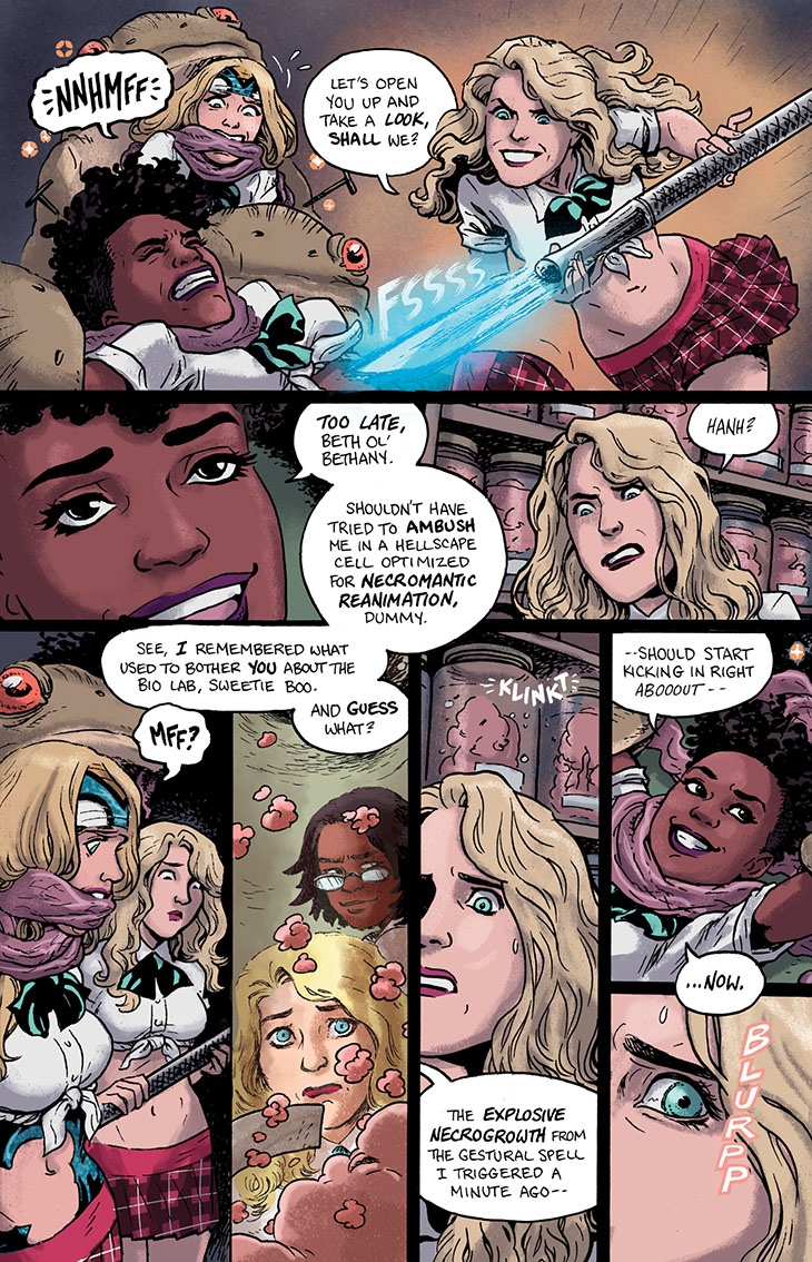 We continue serialization of the collected edition of the six-issue 2018 miniseries Empowered and Sistah Spooky’s High School Hell, written and laid out by me and featuring art and lettering by Guest Artist Carla “Speed” McNeil and coloring by Jenn Manley Lee.