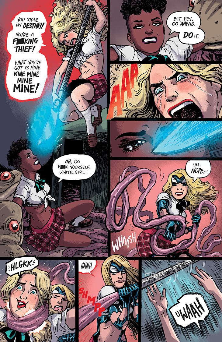We continue serialization of the collected edition of the six-issue 2018 miniseries Empowered and Sistah Spooky’s High School Hell, written and laid out by me and featuring art and lettering by Guest Artist Carla “Speed” McNeil and coloring by Jenn Manley Lee.