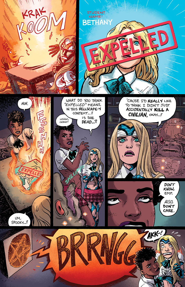 We continue serialization of the collected edition of the six-issue 2018 miniseries Empowered and Sistah Spooky’s High School Hell, written and laid out by me and featuring art and lettering by Guest Artist Carla “Speed” McNeil and coloring by Jenn Manley Lee.