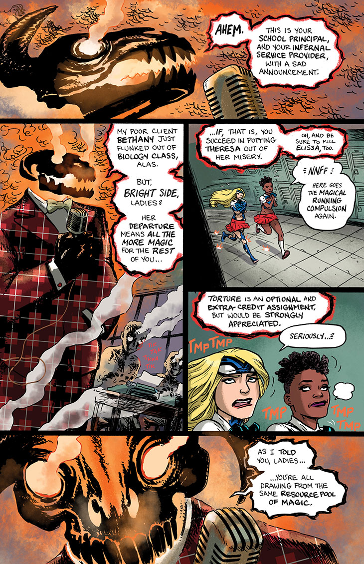 We continue serialization of the collected edition of the six-issue 2018 miniseries Empowered and Sistah Spooky’s High School Hell, written and laid out by me and featuring art and lettering by Guest Artist Carla “Speed” McNeil and coloring by Jenn Manley Lee.