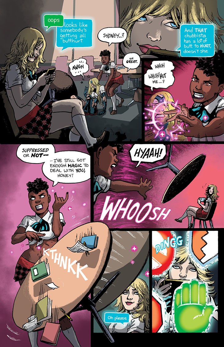We continue serialization of the collected edition of the six-issue 2018 miniseries Empowered and Sistah Spooky’s High School Hell, written and laid out by me and featuring art and lettering by Guest Artist Carla “Speed” McNeil and coloring by Jenn Manley Lee.