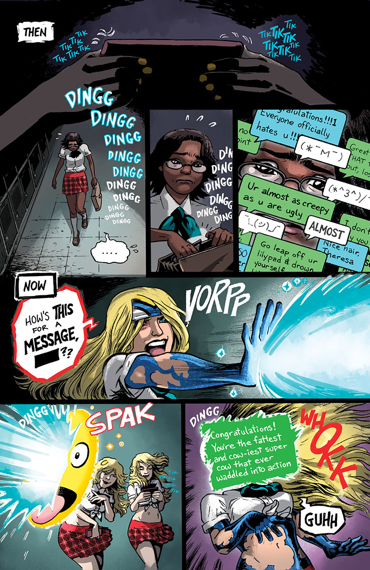 We continue serialization of the collected edition of the six-issue 2018 miniseries Empowered and Sistah Spooky’s High School Hell, written and laid out by me and featuring art and lettering by Guest Artist Carla “Speed” McNeil and coloring by Jenn Manley Lee.