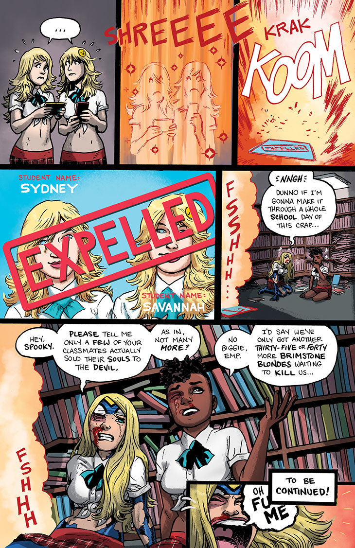 We continue serialization of the collected edition of the six-issue 2018 miniseries Empowered and Sistah Spooky’s High School Hell, written and laid out by me and featuring art and lettering by Guest Artist Carla “Speed” McNeil and coloring by Jenn Manley Lee.