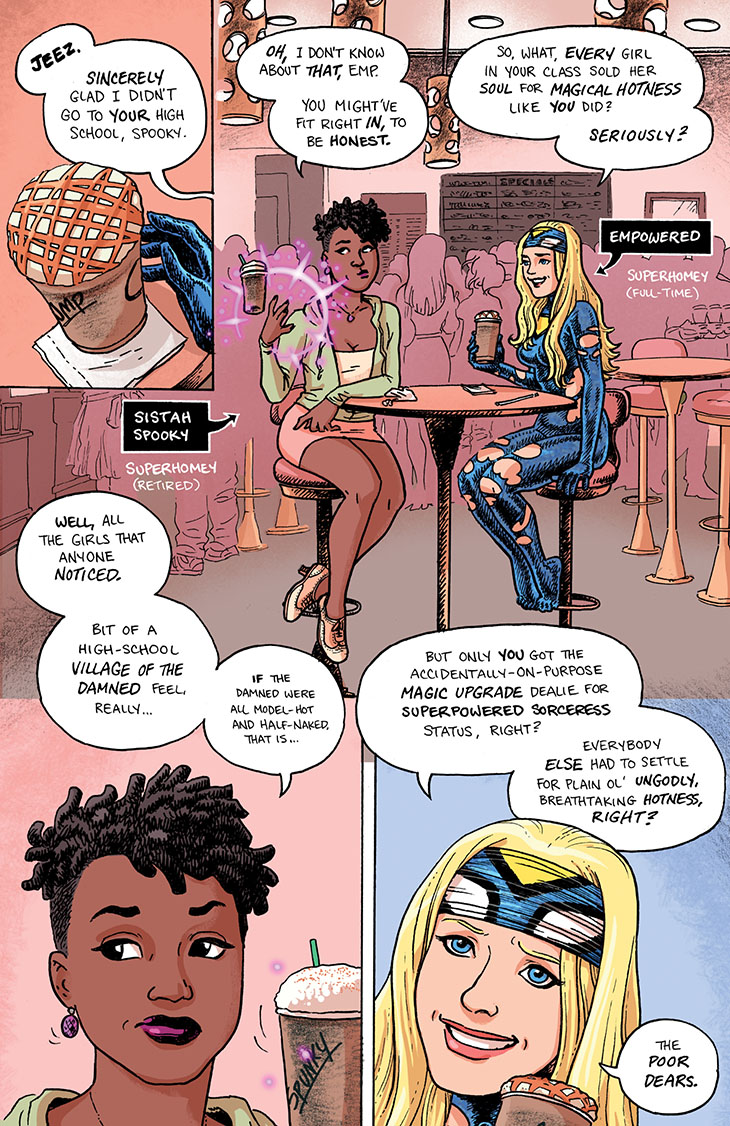 We continue serialization of the collected edition of the six-issue 2018 miniseries Empowered and Sistah Spooky’s High School Hell, written and laid out by me and featuring art and lettering by Guest Artist Carla Speed McNeil and coloring by Jenn Manley Lee.