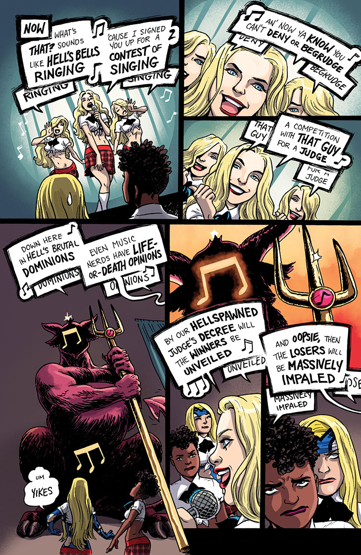 We continue serialization of the collected edition of the six-issue 2018 miniseries Empowered and Sistah Spooky’s High School Hell, written and laid out by me and featuring art and lettering by Guest Artist Carla “Speed” McNeil and coloring by Jenn Manley Lee.