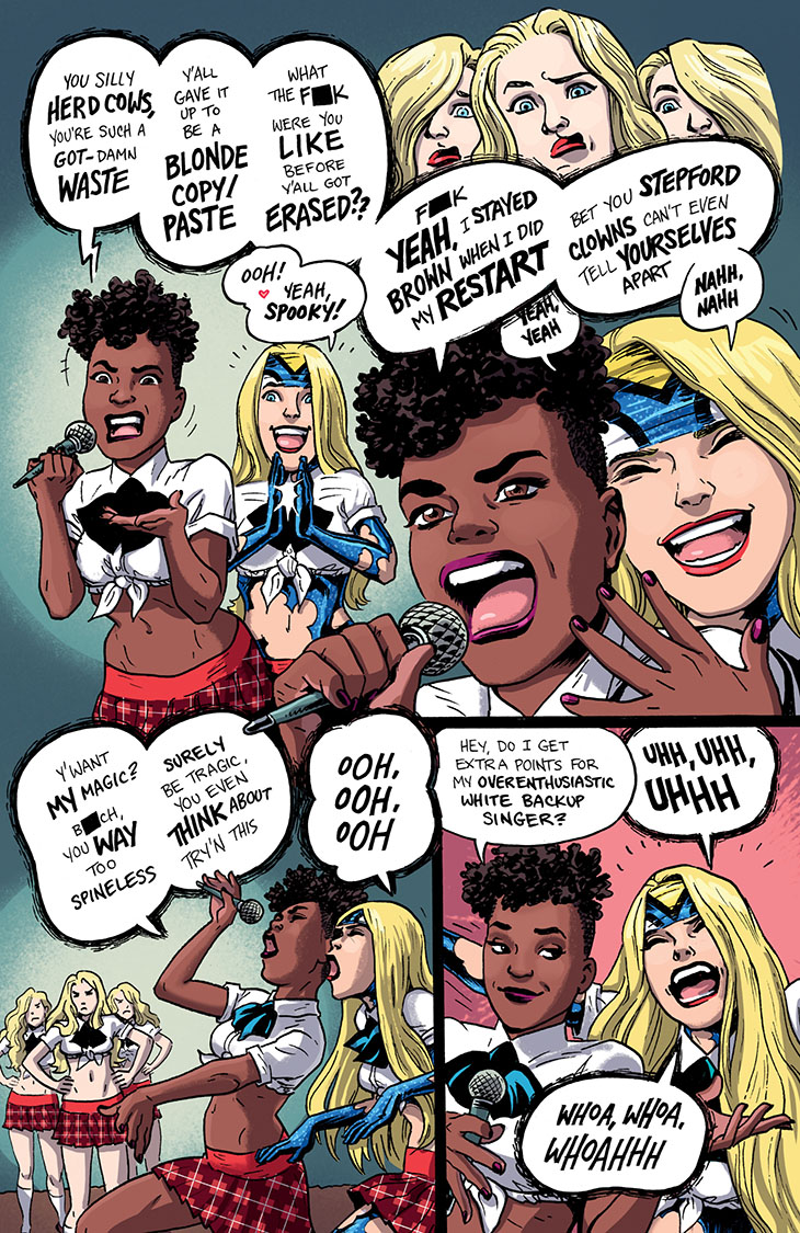Panel 4: Gotta say, the revelation of Emp's heretofore unrecognized desire to be a badass backup singer rather than a star performer still amuses me to no end. Well done, 2018 Writing Me!