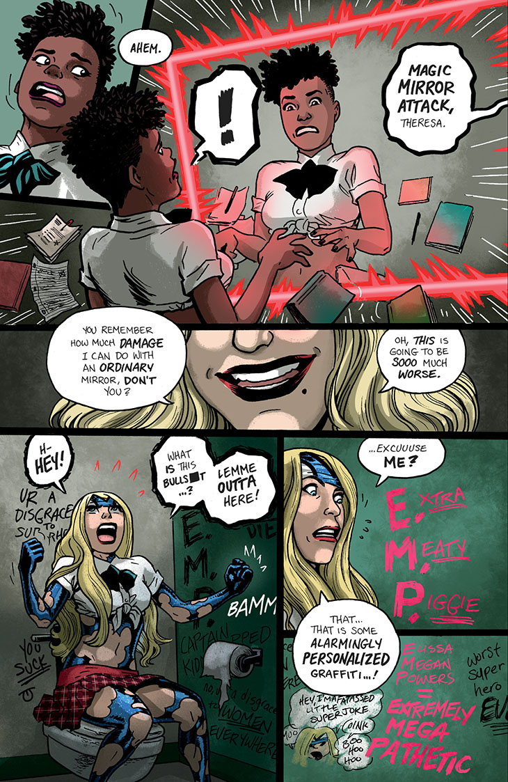 We continue serialization of the collected edition of the six-issue 2018 miniseries Empowered and Sistah Spooky’s High School Hell, written and laid out by me and featuring art and lettering by Guest Artist Carla “Speed” McNeil and coloring by Jenn Manley Lee.