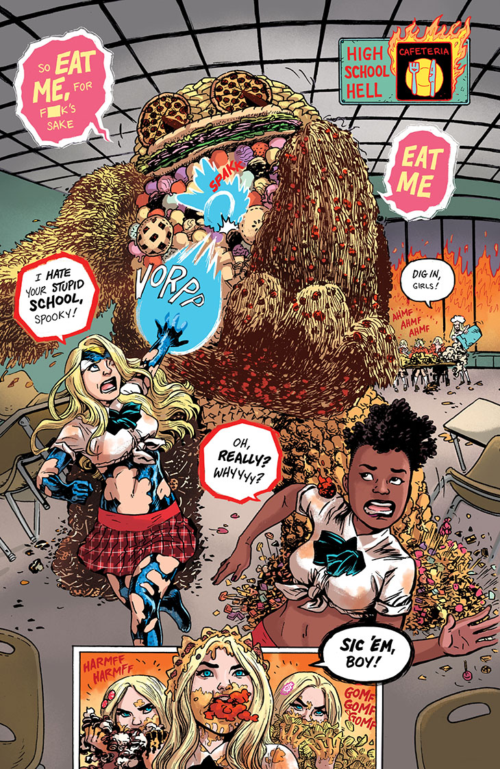 We continue serialization of the collected edition of the six-issue 2018 miniseries Empowered and Sistah Spooky’s High School Hell, written and laid out by me and featuring art and lettering by Guest Artist Carla “Speed” McNeil and coloring by Jenn Manley Lee.