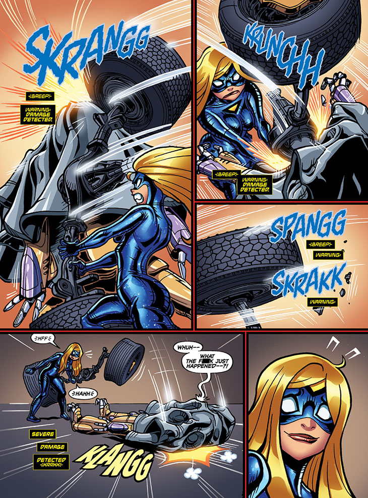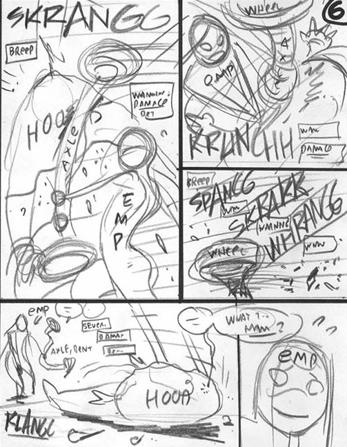 Here's my initial page-rough "thumbnail" for this page from 2013's one-shot Empowered: Animal Style, with final artwork and fine mecha designs by Guest Artist John Staton, sweet colors by Guru EFX, and ace lettering by Blambot's Nate Piekos: