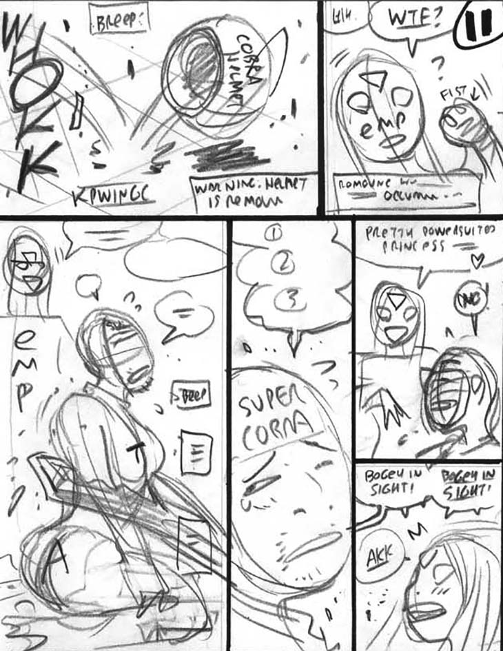 Here's my initial page-rough "thumbnail" for this page from 2013's one-shot Empowered: Animal Style, with final artwork and fine mecha designs by Guest Artist John Staton, sweet colors by Guru EFX, and ace lettering by Blambot's Nate Piekos: