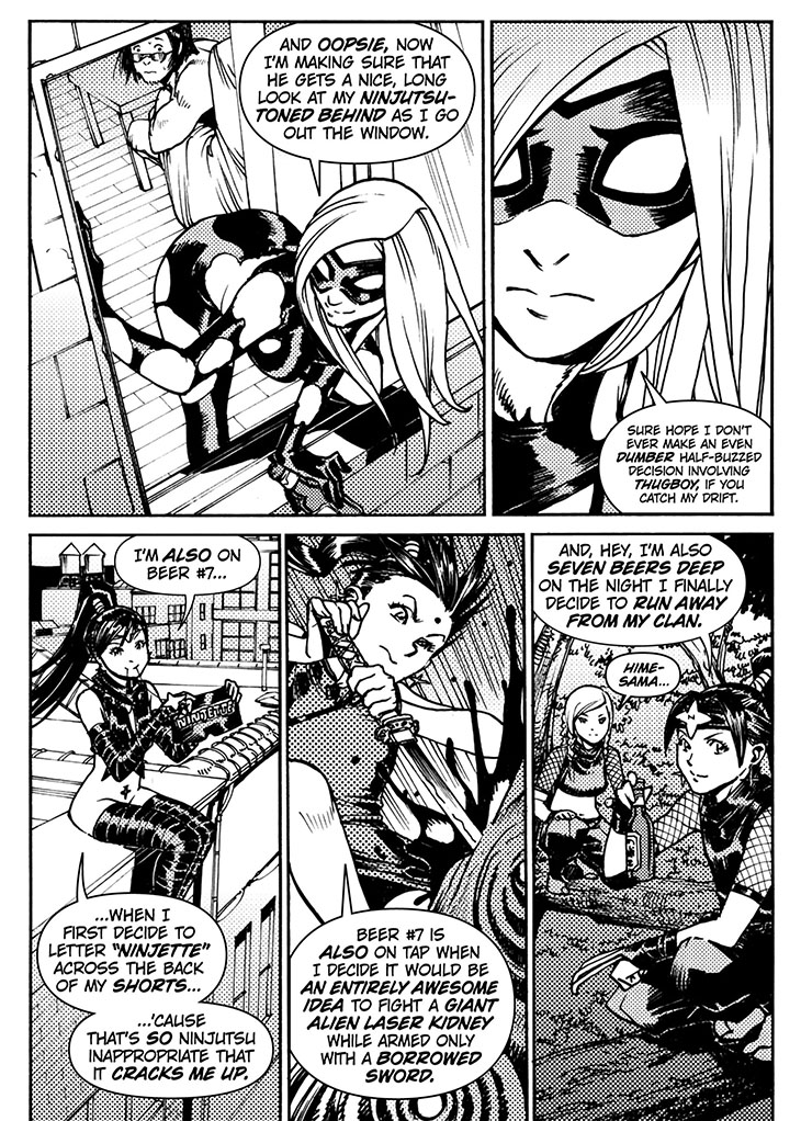 We continue serialization of 2013's one-shot Empowered: Nine Beers with Ninjette (as collected in the anthology volume Empowered Unchained), featuring sweet B&W art by Guest Artist Takeshi Miyazawa and lettering by Susie Lee.
