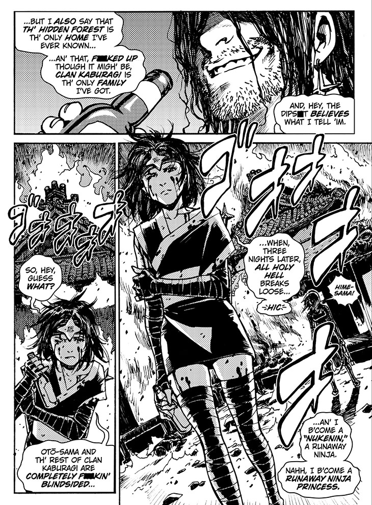 Panel 1: Enjoy one more sweet close-up of Ninjette's father rendered in such dissolute, scrofulous majesty by Takeshi, folks, as this is his final appearance in the one-shot. However, you will be seeing him again in the very next volume I'll be serializing here--that is, the collection of the Guest Artist miniseries Empowered and the Soldier of Love, featuring art by Karla Diaz and an emotionally brutal cameo by ol' NinjDad.