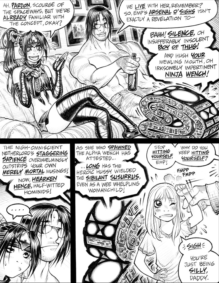 Panel 4: Here, an oblique reference to the fact that the Caged Demonwolf actually speaks to Emp's mom on the phone on occasion, though I can't recall when that factoid would've been mentioned first.