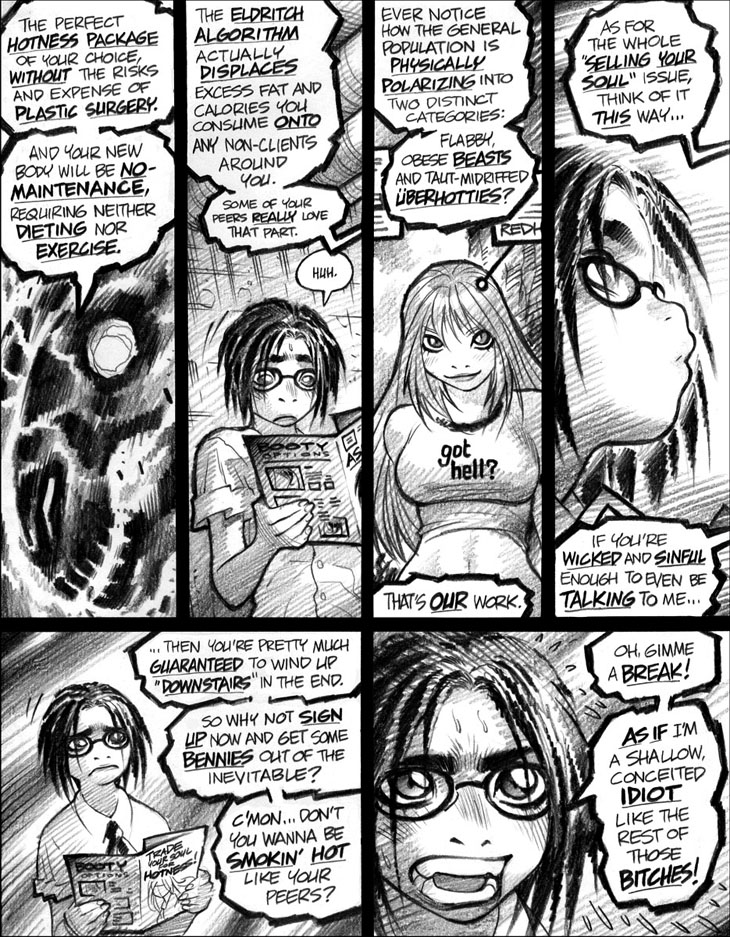 Panel 3’s reference to “polarization of the population” is more than a tad insensitively phrased, but then again, a demon from f**king Hell is delivering this sales pitch, so he’s not likely to use ideally inoffensive terminology. Still, the idea is based more on the ever-widening divergence between the people one sees in real life and the people one sees in TV and film. During my lifetime, the selection of actors and actresses in mass media has, for good or ill, skewed much younger and much, much prettier than was the case in my childhood. (For example, even most contemporary Hollywood “hunks” from the 70s would be considered laughably old, hairy, out-of-shape and, well, "unpretty" by today’s rather more idealized standards.)