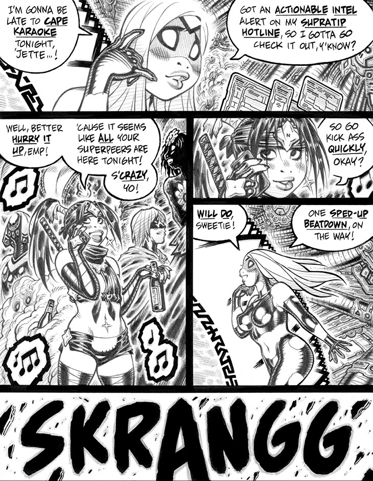 Panel 2: Yeahp, pretty much all of Emp's superpeers are on hand for cape karaoke tonight. You, uh, might want to keep this in mind for future reference, dear readers.