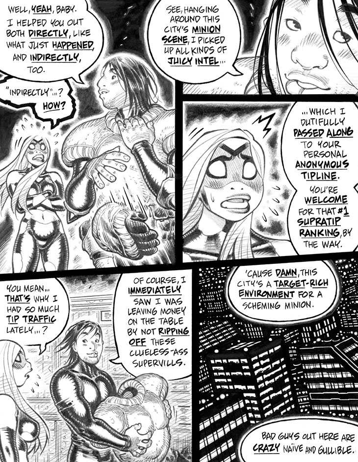 Panel 3: In retrospect, I don't think Thugboy would've actually said the line, "You're welcome for that #1 Supertip ranking, by the way." Even if he knew for sure that his undercover efforts were responsible for that ranking, I still doubt that that he'd express that idea to Emp in such a snarky, even Spooky-like manner; in fact, I sincerely doubt that he would even make that statement to her, period, even in the midst of a vigorous defense of his own actions. That line is way too dismissive (if not undermining) of Emp's labors and really isn't something that Thugboy would say; consider this my mistake as a dialogue writer, folks.