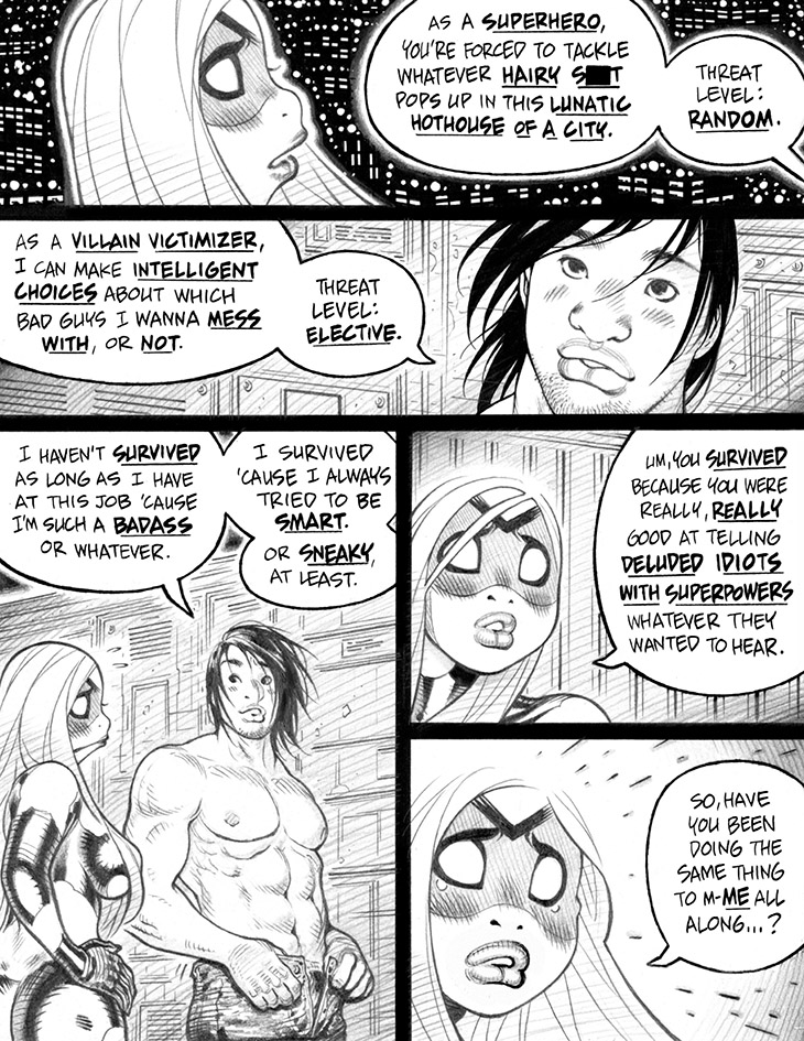 Panel 2: Enjoy another one of my periodic, fumbling attempts to depict Thugboy's face at least semi-realistically, as for a bunch of these shots I was partially photoreferencing him from a reference book of male Japanese models cosplaying (sorta) various action-related outfits.