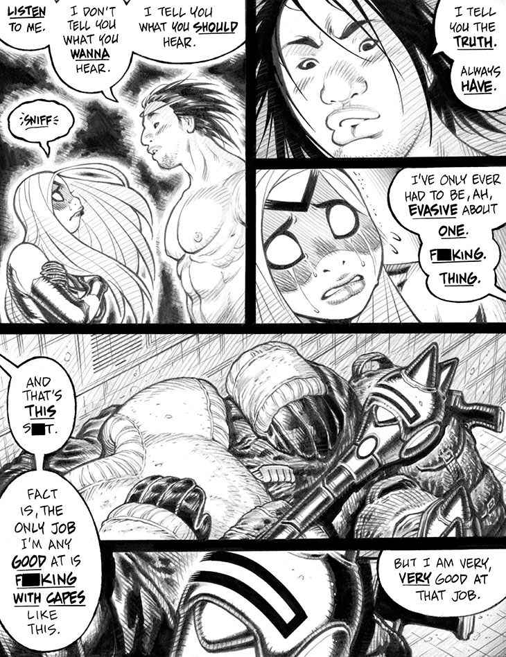 Panel 3: I rather like the idea that Thugboy has so thoroughly walled off any thought of the real issue he's hiding from Emp—as in, his anti-cape activities relating to the San Antonio disaster, six years ago—that he's not even consciously aware that this panel's statement is untrue.