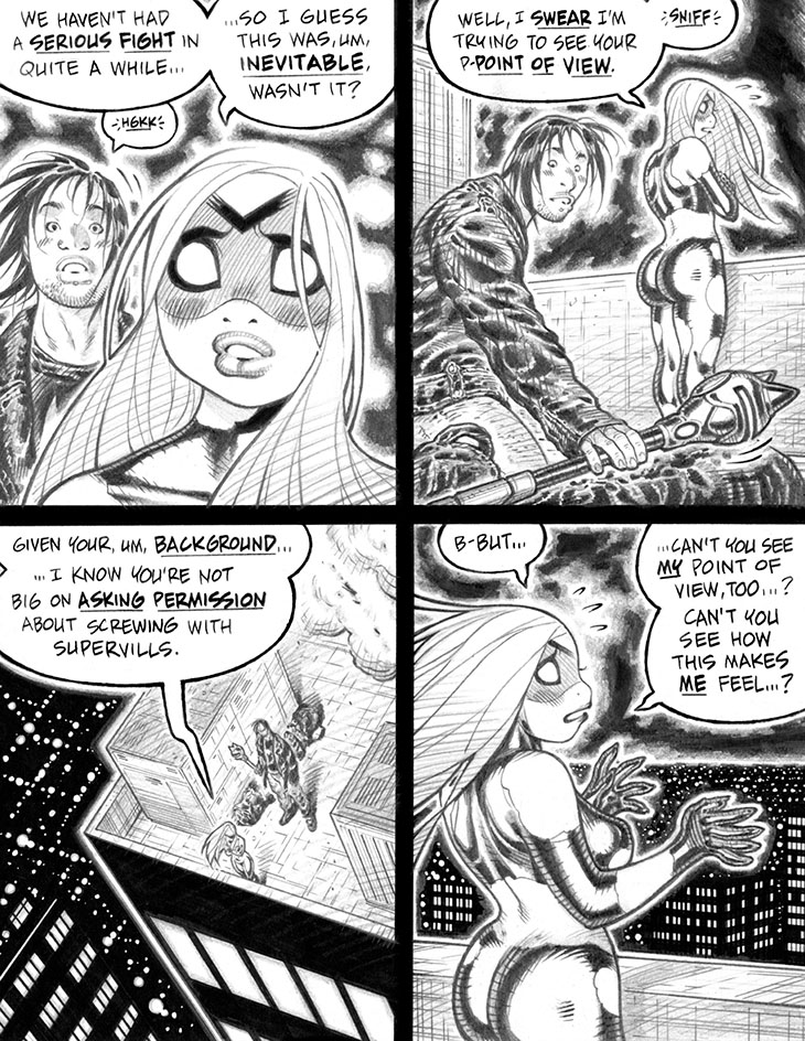 Panel 3: Lordy loo, behold another appearance by the lazy, hacked-out artistic riff I've dubbed "the Zaxxon shot"—that is, a panel featuring near-isometric perspective, which desperate and/or time-pressured comic artists utilize because this camera angle provides for easy, simple placement and orientation of both characters and environmental elements. The Zaxxon shot is also boring, unimaginative, and dull as dishwater, which is why I try to avoid it as much as possible; this time around, though, as Empowered vol. 10 raced through its final pages, I resorted to this hackneyed approach to get through this g-d panel as quickly as possible.