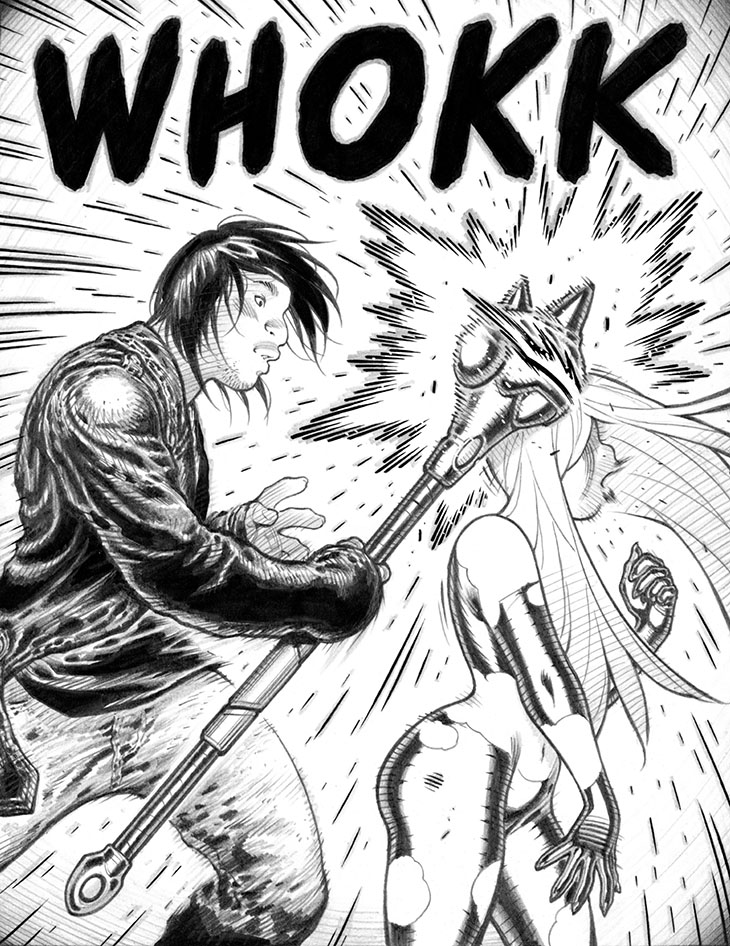 By this point in Empowered, I had long ago integrated a fair amount of inked work into an artistic format that was, early on, entirely pencil-based; all the speed lines, "impact flashes" and motion blurs on this page were inked with PITT Artist Pens because inks are of course immune to smearing—unlike the ultra-soft 5B pencil leads I used for the rest of the page. Yay?