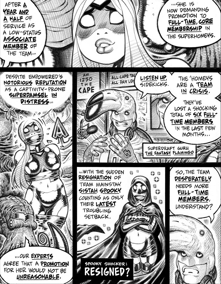 Panel 4: With this panel's caption, note an early use of "text inverted to white-on-black in Photoshop," a trick which works oddly well to disguise how crappy my lettering can get. Dunno why, but I love the look of inverted type like this; no idea if readers agree but, hey, I have to roll with whatever appeals to me as the comic's "first reader."