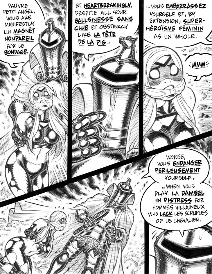 Note that panel 4 is kinda-sorta yet another L-shaped panel, which is of course the oft-mentioned page layout riff that I long ago borrowed from the 70s Red Sonja oeuvre of artist Frank Thorne.