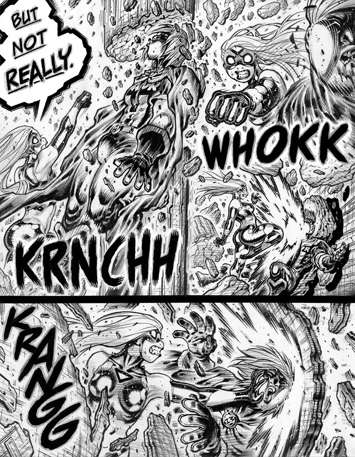 Panels 2-3: I leave it to the reader to decide which impact (either the punch or the knee strike) that the WHOKK sound FX refers to.