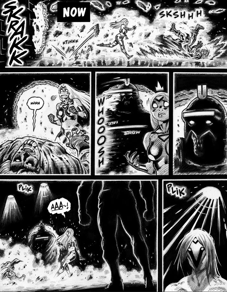 Panel 1: I'm mystified by why the hell that white, gutter-defining line underneath the sound FX "SKRAKK" abruptly terminates before reaching the left side of the page; I must've accidentally inked over it and forgotten to fix the error afterward. (Per Pitch Meeting, "Whoops!" "Whoopsie!")