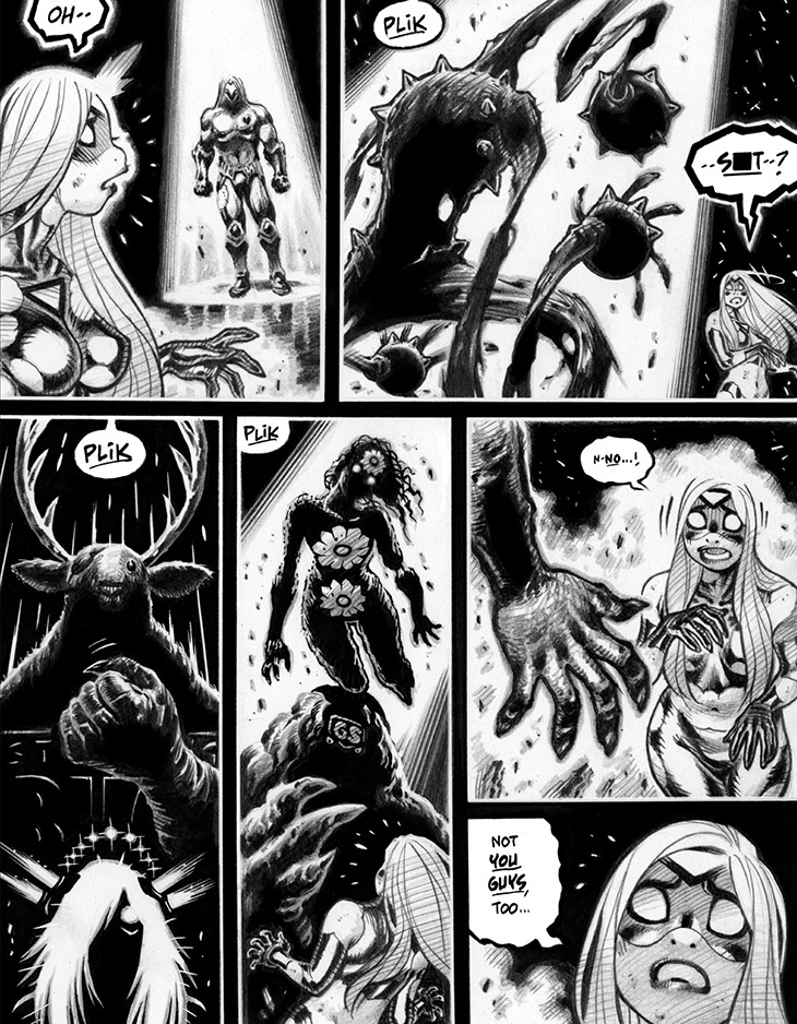 Gotta say that I really like the way these "horror movie" images of the looming Superdead worked out, especially panels 3 and 4. (The Hardkore figure in panel 1, not so much.)