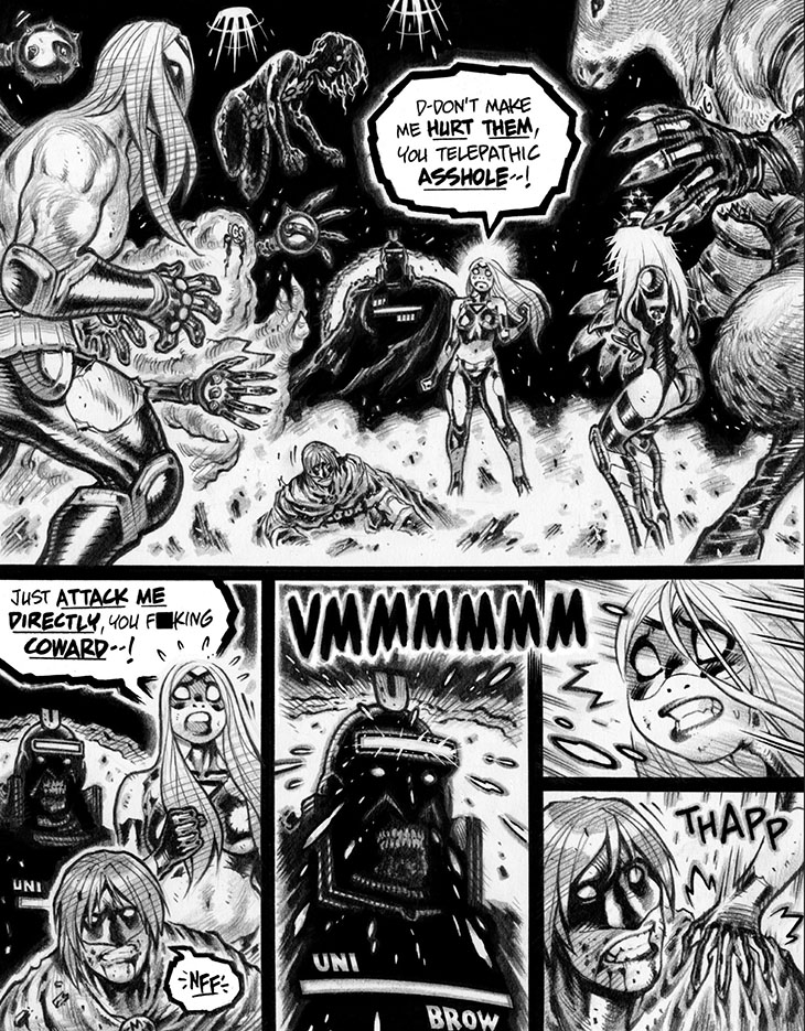 Panel 1: Behold the beauty of using an unclear ground plane in a low-angled shot, dear readers, as I didn't have to work out the proper perspective for this scene due to said lack of clarity. The point here isn't to hide the characters' feet but to conceal the actual positioning of their feet in relation to each other, so as to allow a quickly "eyeballed" composition without technical perspective construction.