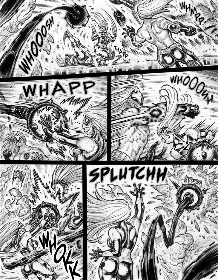 Panel 1: Lordy loo, another example of "two different actions in a single panel" as we see double images of Emp springing back to her feet! IIRC, this is a riff borrowed pretty directly from a single moment in an obscure martial-arts manga titled Kenji that I read back in the mid-to-late 80s, a riff that seems to have indelibly lodged in my memory over the long decades since.