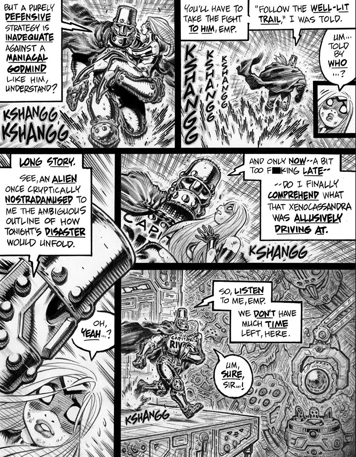 Panel 2: Can't say for certain, but I strongly suspect that the wee little square insert panel of Emp at lower right is a storytelling riff cribbed from the comic Outcast by Robert Kirkman and Paul Azaceta, in which such wee insert close-ups appear constantly. I loved the approach of adding a li'l dose of facial expression without burning an entire, full-sized panel on such a shot, hence my borrowing of the riff.
