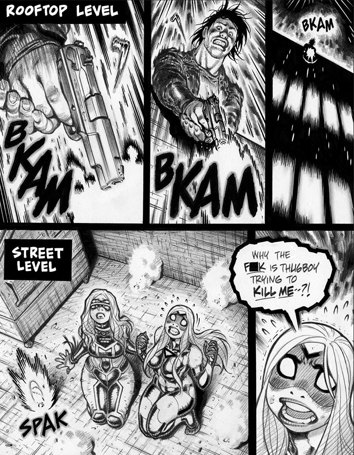Panel 4: Ehh, would've been a tad awkward if Thugboy's shots were impacting where Mindf**k was kneeling, for reasons that will be clarified shortly.