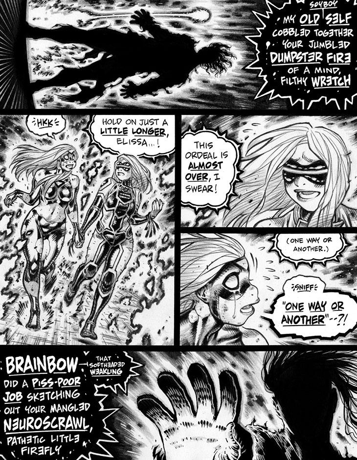 Panels 1 and 5: Note that Neurospear's involuntary moments of telepathic "extra-honesty" are formatted quite differently than Mindf**k's parenthetically blurted asides.