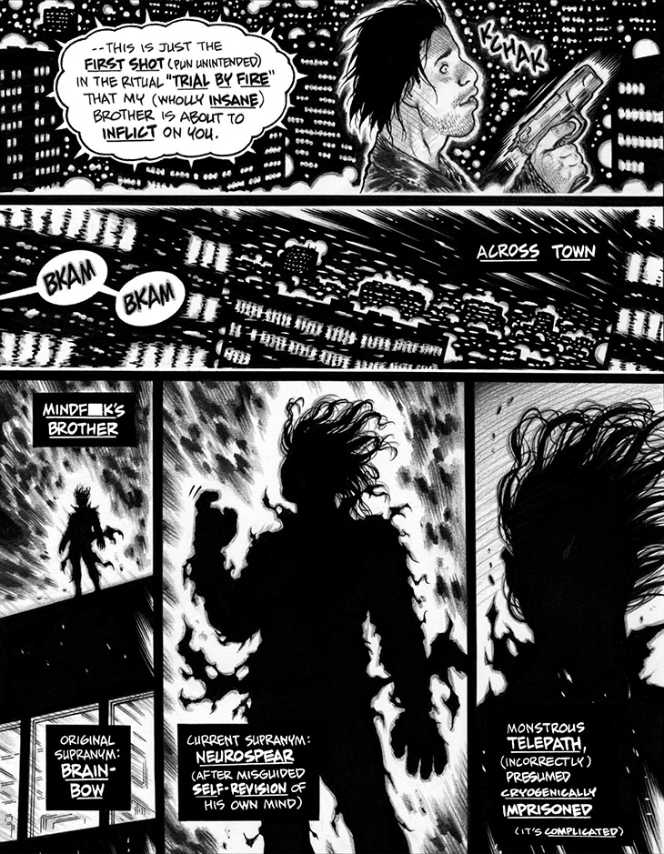 Panels 1 & 2: Behold also the terrible majesty of what I've dubbed "blobby window lights" in those background buildings across the cityscape. Gotta say, I'm a bit annoyed that these out-of-focus shapes look much better (to my eye, at least) than the crisply outlined window lights that I've been rendering throughout my entire g-d career, dating all the way back to the first Dirty Pair miniseries in 1988. (I should note that said crisply outlined visual riffs were derived from Otomo Katsuhiro's work on Akira, along with a veritable passel of other borrowed techniques.)