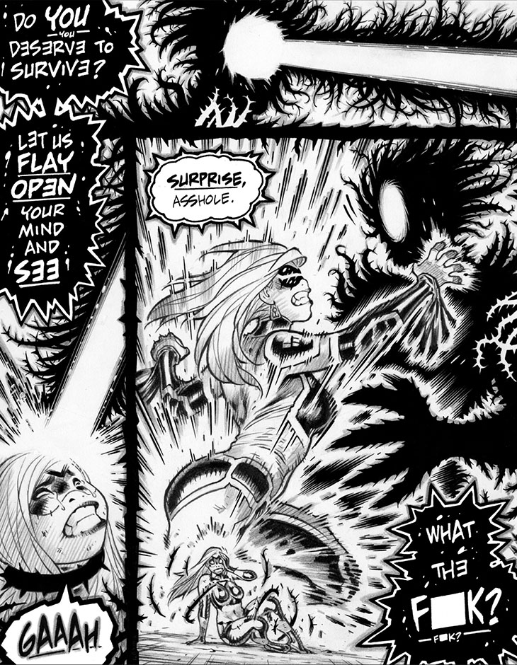 Panel 1: I'd forgotten about Neurospear's "beam of telepathy" having a black aura of thorns, which I have to admit looks damn kickass in a visual sense. Wheeeee!