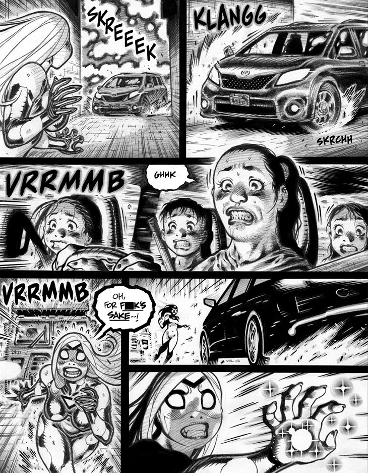 For one thing, using sound FX that overlapped the panel borders (for SKREEEK and KLANGG) might've helped; on the same tip, I could've gotten much more aggressive with the two VRRMMBs and had them impinging on or partially obscuring the word balloons (and borders) to indicate the SFXs' volume, a move which could've added some much-needed energy.