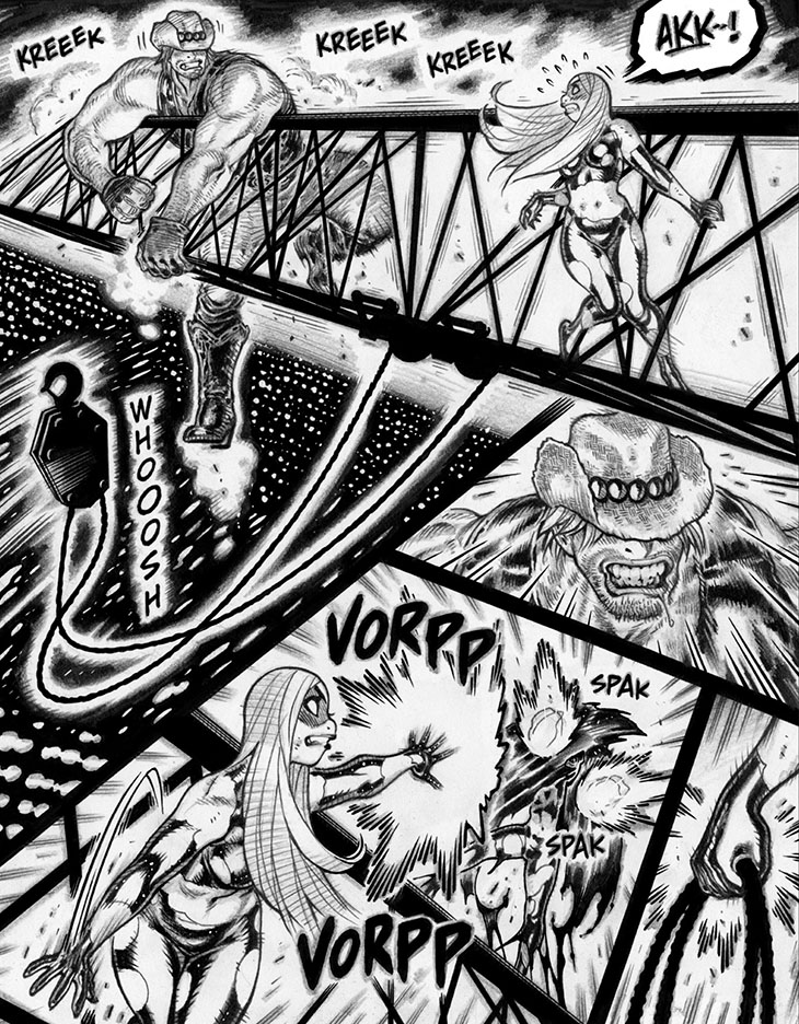 Panels 2-4: Enjoy a brief return of my once-beloved "tilty panel borders," dear readers! I used to use such angled page layouts aaaalllll the time in my pre-Empowered comics work, both to add a bonus dash of compositional dynamism and also to eke out a wee bit of extra space for a given panel's artwork elements. (Empowered comic pages are mostly based on a grid-like template marked out into fifths, quarters and thirds, so such "angly" approaches are much rarer here.)