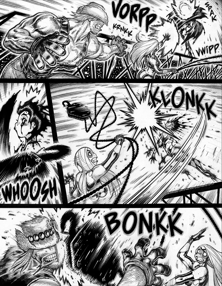 Whole lotta inking on this page, you might notice, which might have made things a bit easier on my drawing hand—as opposed to having to grind out all this imagery in pencil—but certainly did my productivity no favors. Then again, that was true for all of Empowered vol. 11, during which I was only rarely able to write and draw more than roughly 15 pages per month; needless to say, you want to be in the more viable production range of 20-30pp per month. (Oh, well.)