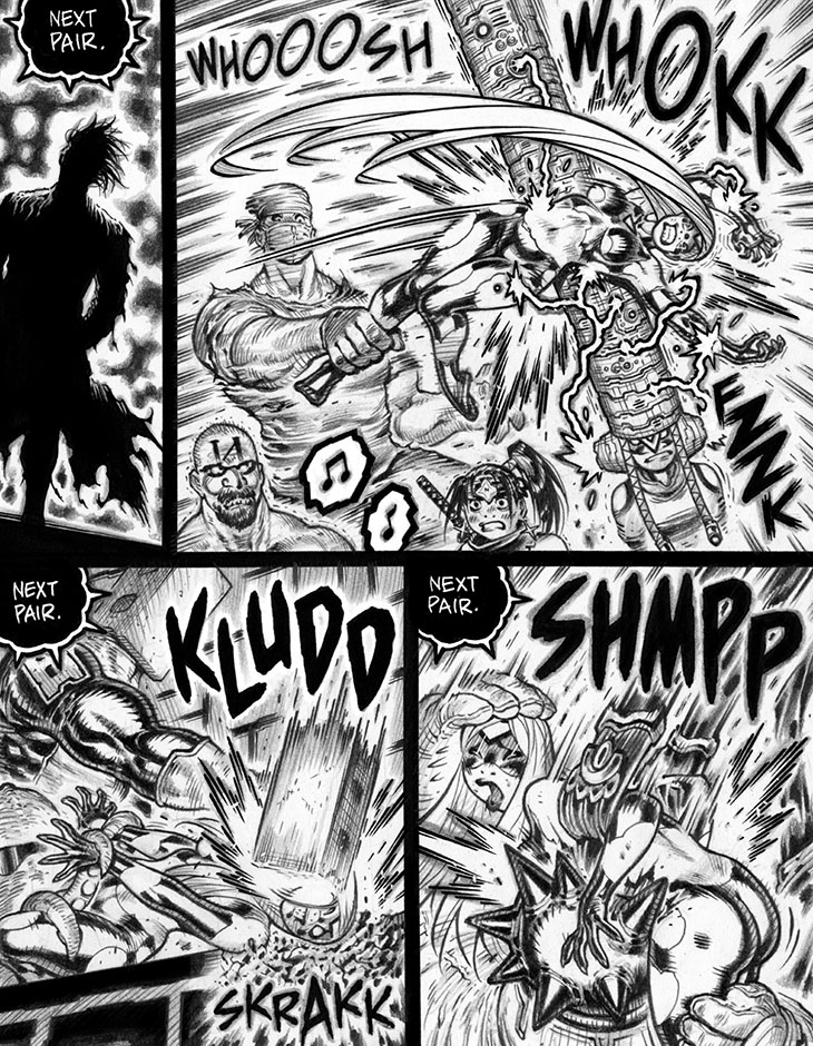 Panel 1: Oddly enough, this shot of Neurospear looks eerily like one of the many sweet, high-contrast images of the titular character from Boichi's manga Sun-Ken Rock. Dunno if that's just a coincidence, or if I was actually homaging a panel from the series; why, maybe I should go back to the manga and read it all the way through again to make sure!