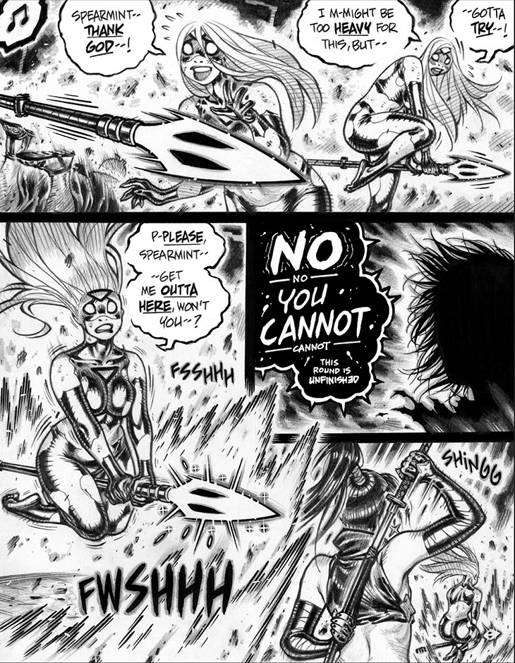 Panel 4: Nitpicking alert: Annoyingly enough, I forgot to draw Ninjette's g-d headband in this shot. Dagnabbit!