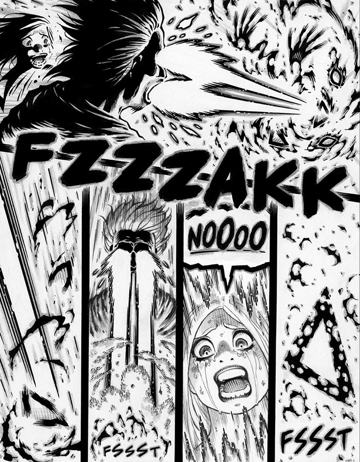 Panel 4: Ehh, probably should've extended Emp's Anakin-istic "NOOOOO" rightward to overlap into the successive shot of her supersuit vaporizing. Not a big deal, but that approach is something I would definitely consider doing nowadays.